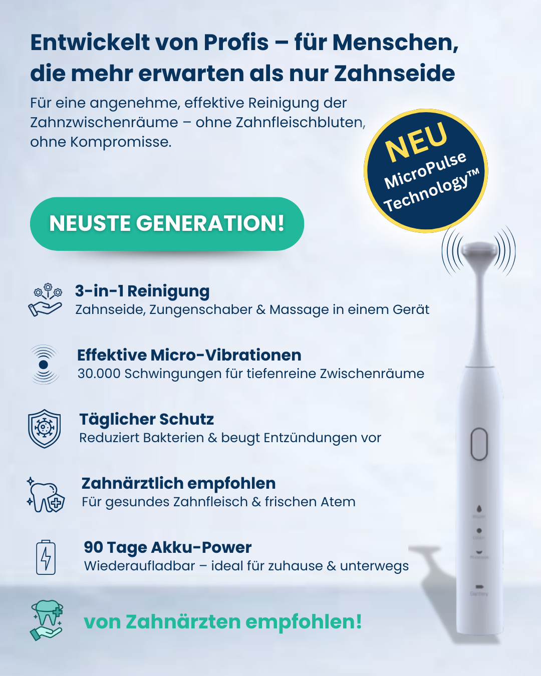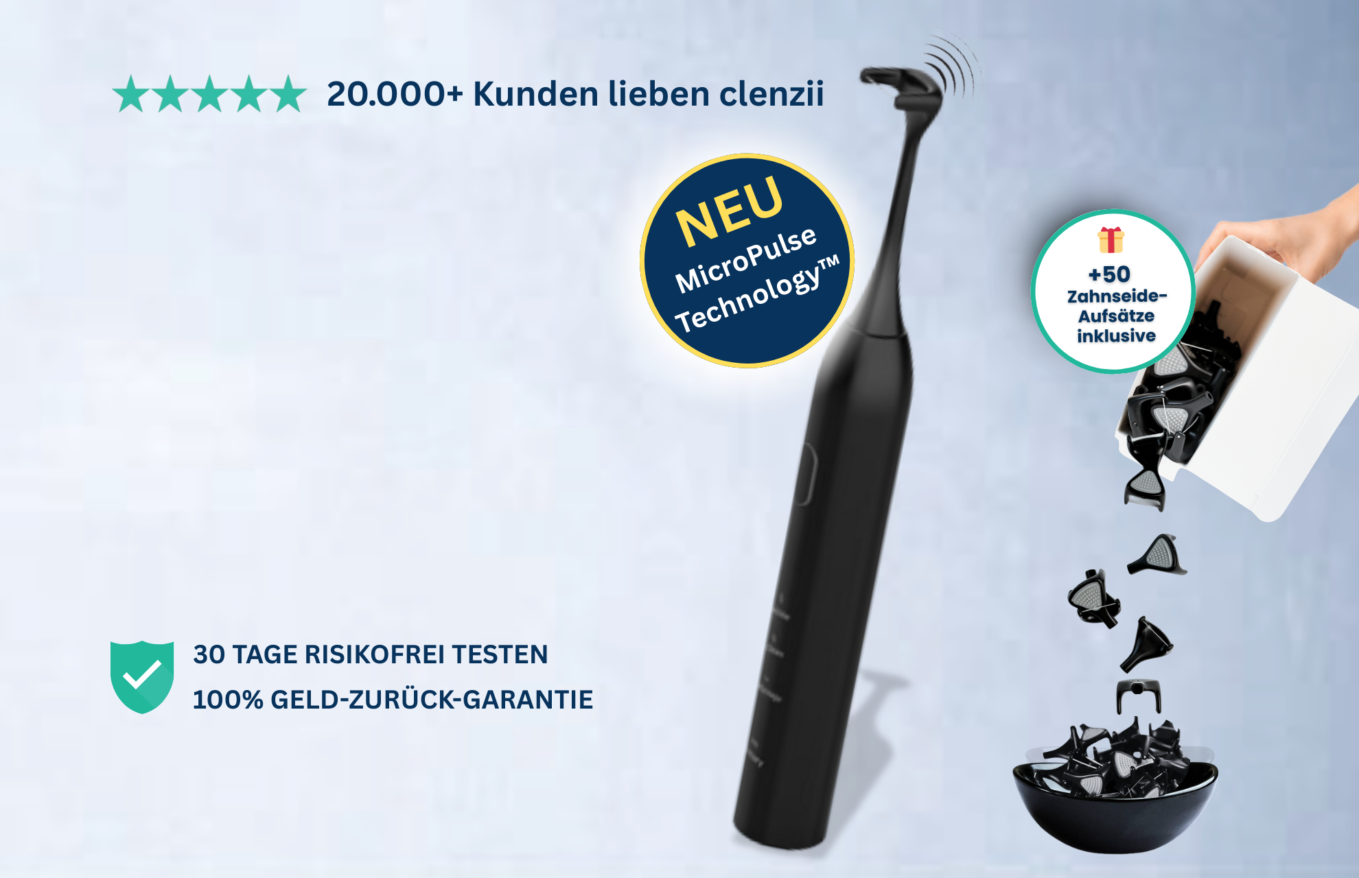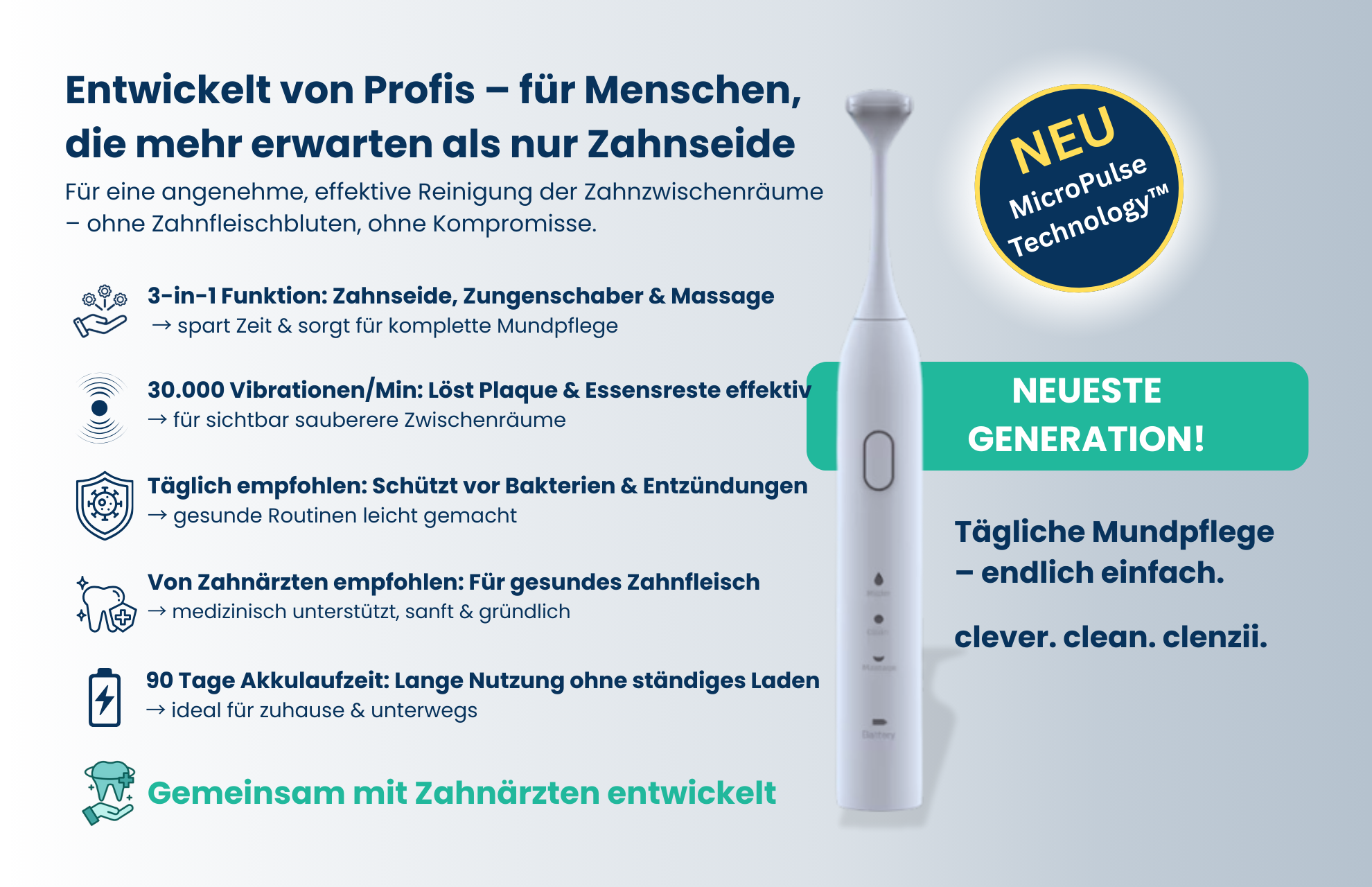 Ja, clenzii wurde speziell auch für empfindliches Zahnfleisch entwickelt. Die sanften Mikrovibrationen und die gewebte Seide reinigen gründlich, ohne das Zahnfleisch zu reizen. Viele Nutzer:innen berichten sogar von einer spürbaren Verbesserung ihres Zahnfleischzustands.