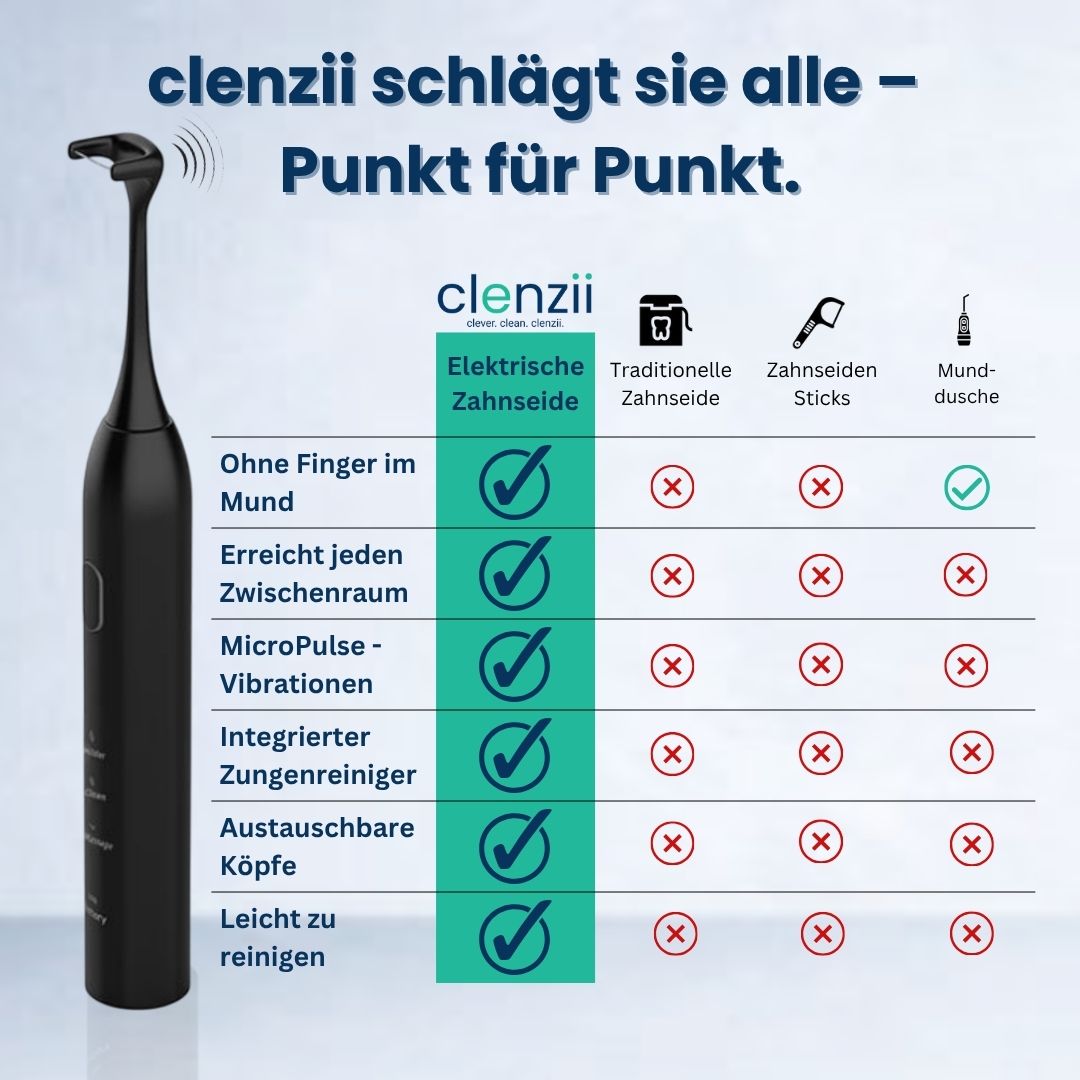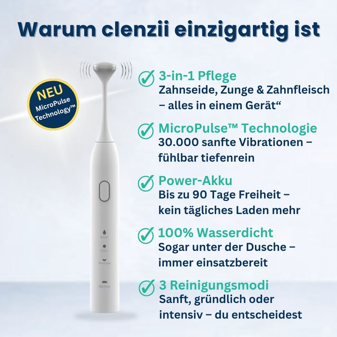Moderne Zahnpflege im Vergleich. Clenzii überzeugt mit Komfort & Technik – spürbar jeden Tag.